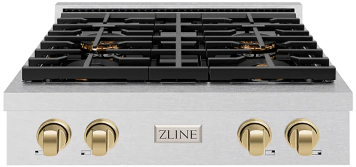 The ZLINE Autograph Edition 30 in. Paramount Gas Rangetop with 4 Burner DuoPro™ Cooktop in Satin Stainless Steel and Polished Gold Accents (PSRTSZ-30-G) features a high-powered gas cooktop with 4 hand-crafted Italian dual-ring brass burners and an expansive one-piece porcelain cooktop allowing you to master every meal.Read More