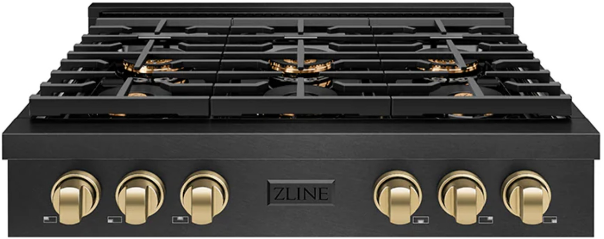 The ZLINE Autograph Edition 36 in. Paramount Gas Rangetop with 6 Burner DuoPro™ Cooktop in Black Satin Stainless Steel and Polished Gold Accents (PSRTBSZ-36-G) features a high-powered gas cooktop with 6 hand-crafted Italian dual-ring brass burners and an expansive one-piece porcelain cooktop allowing you to master every meal.Read More