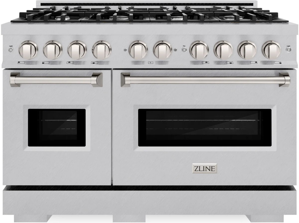 The ZLINE 48 in. 6.7 cu. ft. Classic Double Oven Dual Fuel Range with 8 Burner Gas Cooktop in Satin Stainless Steel (CDRS-48) combines the elegance of a hand-finished porcelain gas cooktop with 8 Italian-made auto-reignition burners, a large electric convection oven with an energy-efficient cooling fan to ensure quiet operation, a small bake-and-broil oven, and Landscape oven door window designs allowing you to master every meal.