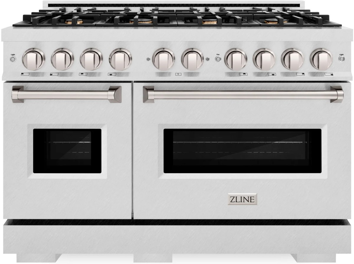 The ZLINE 48 in. 6.7 cu. ft. Classic Double Oven Dual Fuel Range in Satin Stainless Steel with 8 Brass Burners (CDRS-BR-48) combines the elegance of a hand-finished porcelain gas cooktop with 8 Italian-made brass auto-reignition burners, a large electric convection oven with an energy-efficient cooling fan to ensure quiet operation, a small bake-and-broil oven, and Landscape oven door window designs allowing you to master every meal.