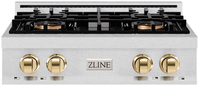 The ZLINE Autograph Edition 30 in. Classic Gas Rangetop with 4 Burner DuoPro™ Cooktop in Satin Stainless Steel and Polished Gold Accents (PCRTSZ-30-G) features a high-powered gas cooktop with 4 hand-crafted Italian dual-ring brass burners and an expansive one-piece porcelain cooktop allowing you to master every meal.Read More