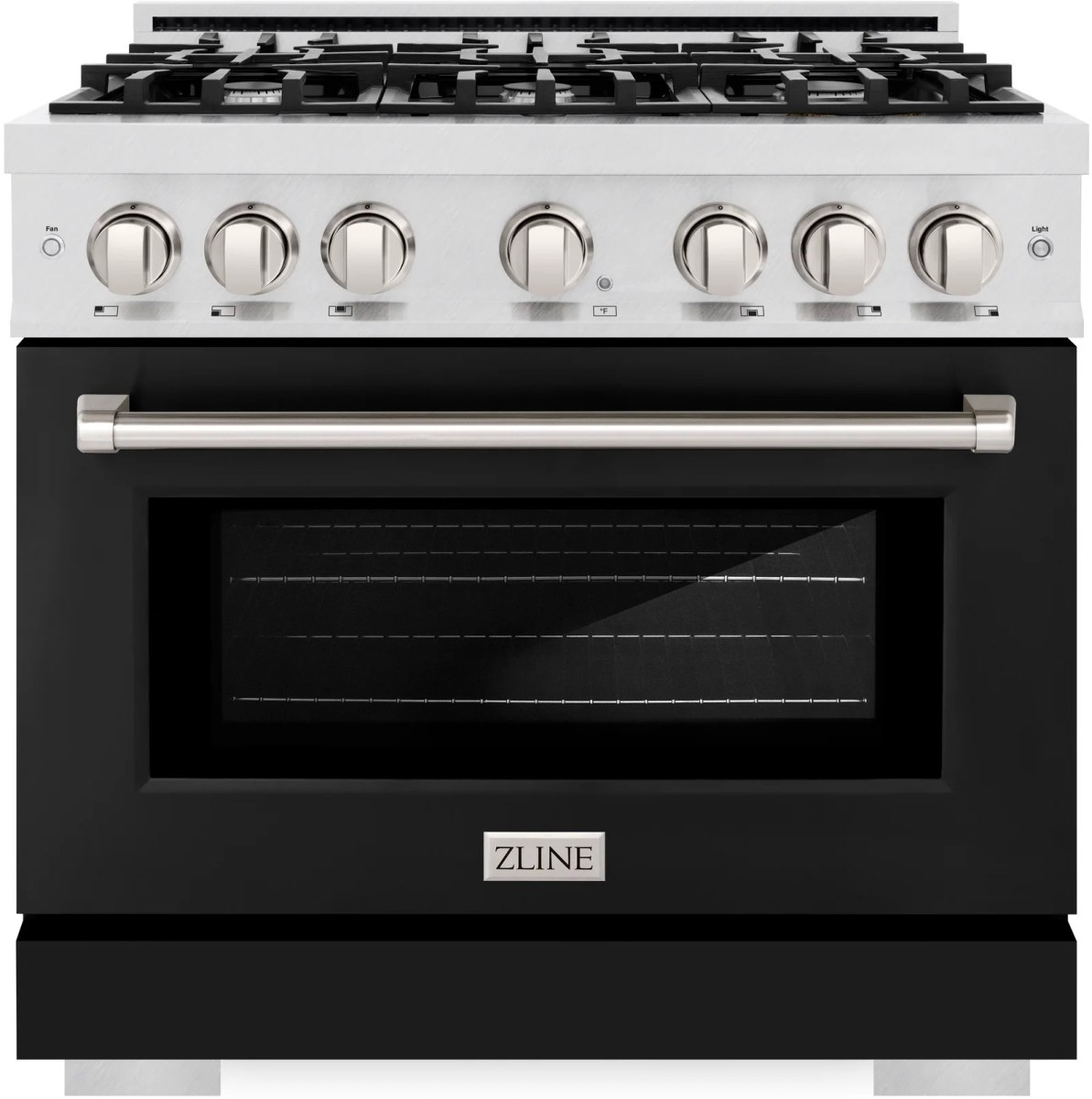 The ZLINE 36 in. 5.2 cu. ft. Select Gas Range with 6 Burner Cooktop and Convection Gas Oven in Satin Stainless Steel with Black Matte Door (HGRS-BLM-36) combines the elegance of a hand-finished porcelain gas cooktop with 6 Italian-made auto-reignition burners, a gas convection oven with an energy-efficient cooling fan to ensure quiet operation, and a beautiful black matte door with a Horizon window design allowing you to master every meal.