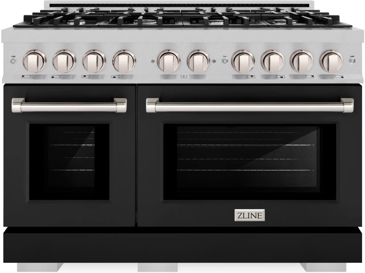 The ZLINE 48 in. 6.7 cu. ft. Select Double Oven Gas Range with 8 Burner Cooktop in Satin Stainless Steel with Black Matte Doors (HGRS-BLM-48) combines the elegance of a hand-finished porcelain gas cooktop with 8 Italian-made auto-reignition burners, a large gas convection oven with an energy-efficient cooling fan to ensure quiet operation, a small baking oven, and beautiful black matte doors with Horizon window designs allowing you to master every meal.