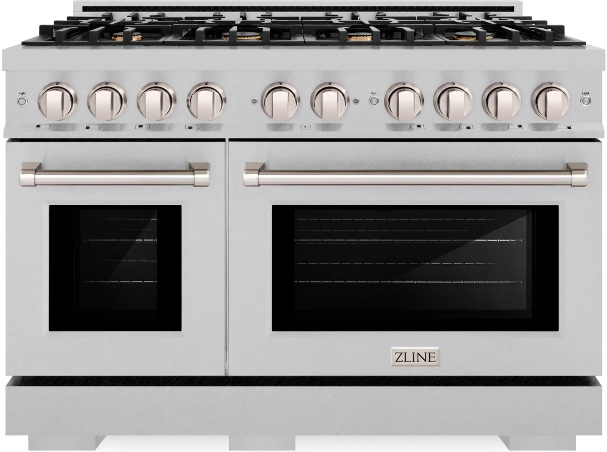 The ZLINE 48 in. 6.7 cu. ft. Select Double Oven Dual Fuel Range in Satin Stainless Steel with 8 Brass Burners (HDRS-BR-48) combines the elegance of a hand-finished porcelain gas cooktop with 8 Italian-made brass auto-reignition burners, a large electric convection oven with an energy-efficient cooling fan to ensure quiet operation, a small bake-and-broil oven, and Horizon oven door window designs allowing you to master every meal.