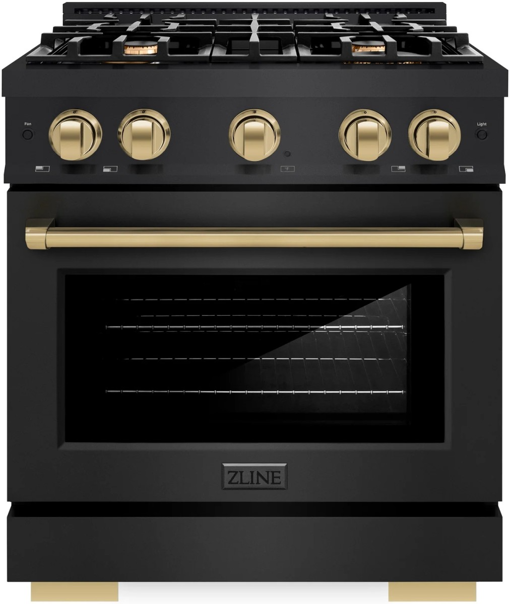 The ZLINE Autograph Edition 30 in. 4.2 cu. ft. Select Dual Fuel Range with 4 Burner Gas Cooktop and Electric Convection Oven in Black Stainless Steel with Champagne Bronze Accents (HDRBZ-30-CB) combines the elegance of a hand-finished porcelain gas cooktop with 4 Italian-made auto-reignition burners, an electric convection oven with an energy-efficient cooling fan to ensure quiet operation, a Horizon oven door window design, and stunning champagne bronze knobs and handle allowing you to master every meal.