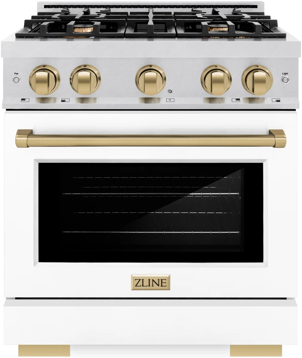 The ZLINE Autograph Edition 30 in. 4.2 cu. ft. Select Gas Range with 4 Burner Cooktop and Convection Gas Oven in Satin Stainless Steel with White Matte Door and Champagne Bronze Accents (HGRSZ-WM-30-CB) combines the elegance of a hand-finished porcelain gas cooktop with 4 Italian-made auto-reignition burners, a gas convection oven with an energy-efficient cooling fan to ensure quiet operation, a beautiful white matte door with a Horizon window design, and stunning champagne bronze knobs and handle allowing you to master every meal.