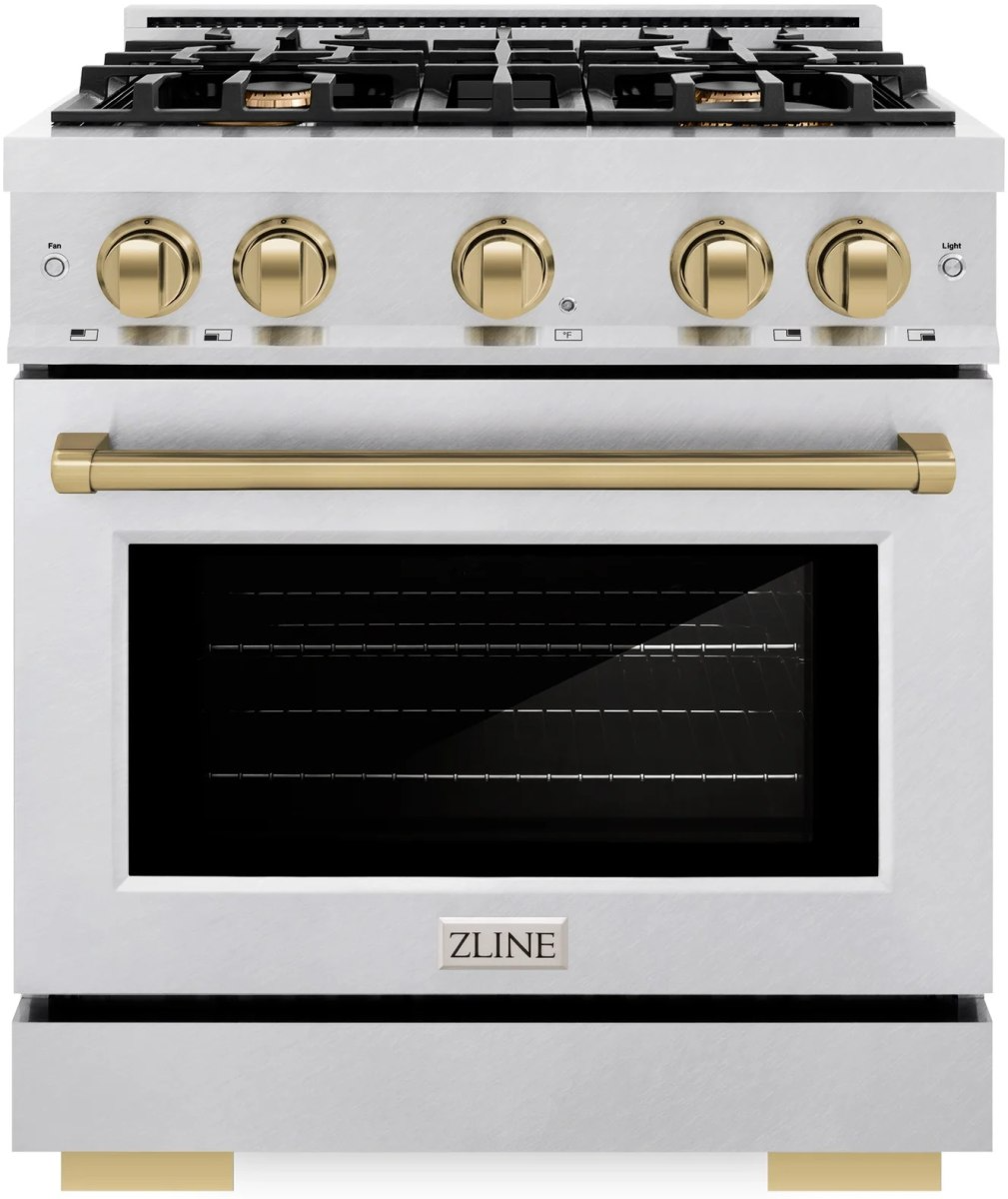The ZLINE Autograph Edition 30 in. 4.2 cu. ft. Select Dual Fuel Range with 4 Burner Gas Cooktop and Electric Convection Oven in Satin Stainless Steel with Champagne Bronze Accents (HDRSZ-30-CB) combines the elegance of a hand-finished porcelain gas cooktop with 4 Italian-made auto-reignition burners, an electric convection oven with an energy-efficient cooling fan to ensure quiet operation, a Horizon oven door window design, and stunning champagne bronze knobs and handle allowing you to master every meal.