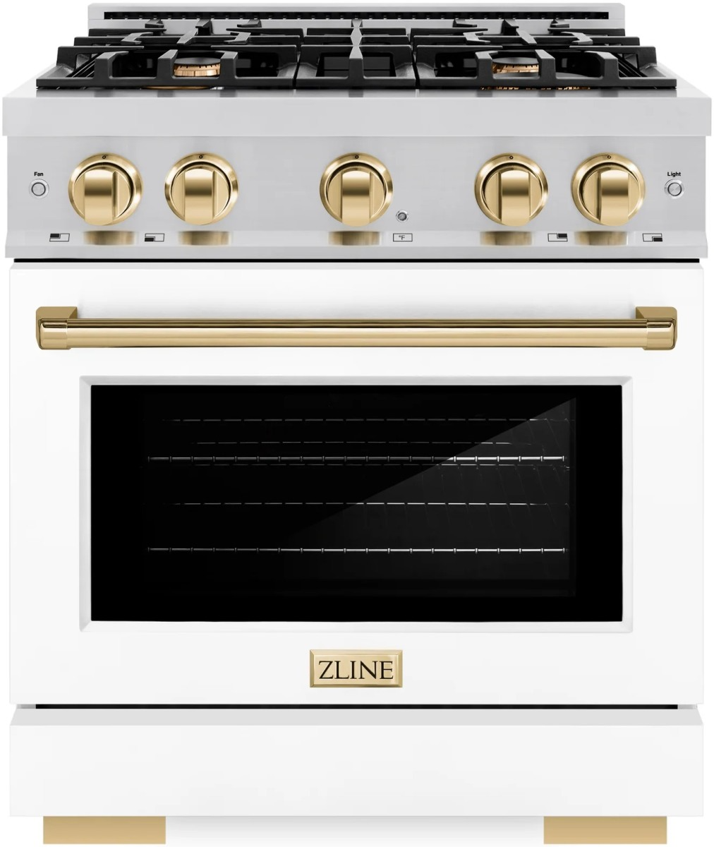 The ZLINE Autograph Edition 30 in. 4.2 cu. ft. Select Gas Range with 4 Burner Cooktop and Convection Gas Oven in Stainless Steel with White Matte Door and Polished Gold Accents (HGRZ-WM-30-G) combines the elegance of a hand-finished porcelain gas cooktop with 4 Italian-made auto-reignition burners, a gas convection oven with an energy-efficient cooling fan to ensure quiet operation, a beautiful white matte door with a Horizon window design, and stunning polished gold knobs and handle allowing you to master every meal.