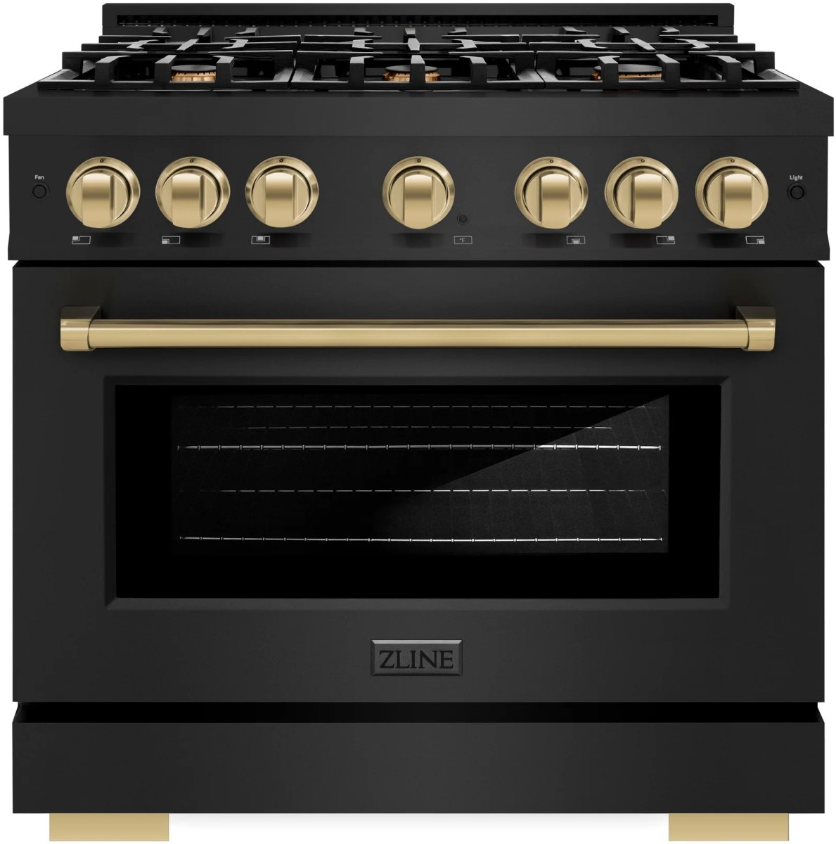 he ZLINE Autograph Edition 36 in. 5.2 cu. ft. Select Dual Fuel Range with 6 Burner Gas Cooktop and Electric Convection Oven in Black Stainless Steel with Champagne Bronze Accents (HDRBZ-36-CB) combines the elegance of a hand-finished porcelain gas cooktop with 6 Italian-made auto-reignition burners, an electric convection oven with an energy-efficient cooling fan to ensure quiet operation, a Horizon oven door window design, and stunning champagne bronze knobs and handle allowing you to master every meal.