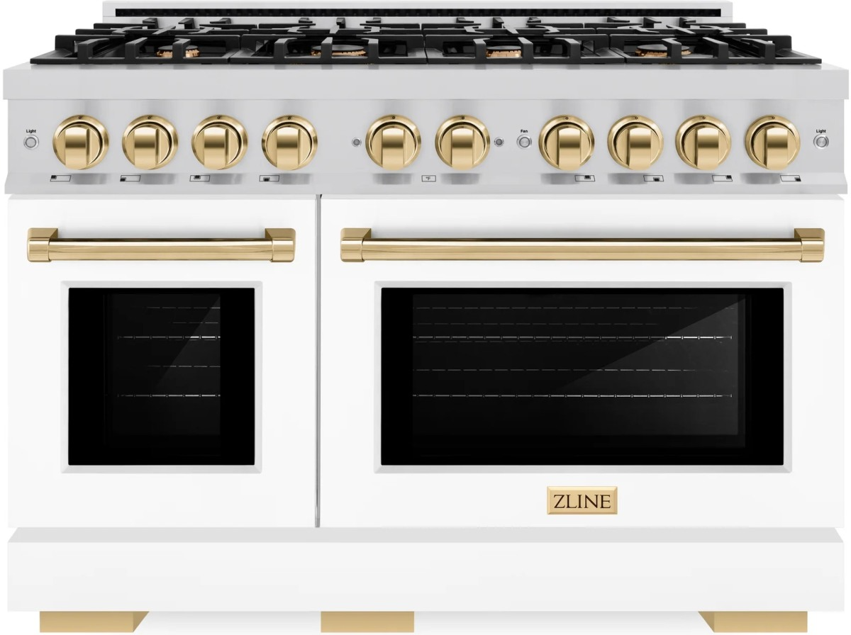The ZLINE Autograph Edition 48 in. 6.7 cu. ft. Select Double Oven Gas Range with 8 Burner Cooktop in Stainless Steel with White Matte Doors and Polished Gold Accents (HGRZ-WM-48-G) combines the elegance of a hand-finished porcelain gas cooktop with 8 Italian-made auto-reignition burners, a large gas convection oven with an energy-efficient cooling fan to ensure quiet operation, a small baking oven, beautiful white matte doors with Horizon window designs, and stunning polished gold knobs and handles allowing you to master every meal.